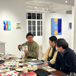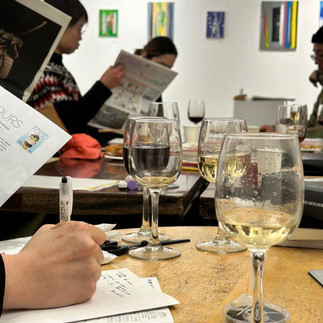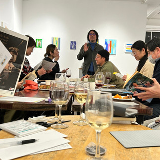 会場内をぐるっと回りおえたら、同時代ギャラリー地階のアンデパンダンから届いたケータリング料理と、先生が用意してくださったとっておきのお酒を楽しみながら、生徒同士での交流の時間。